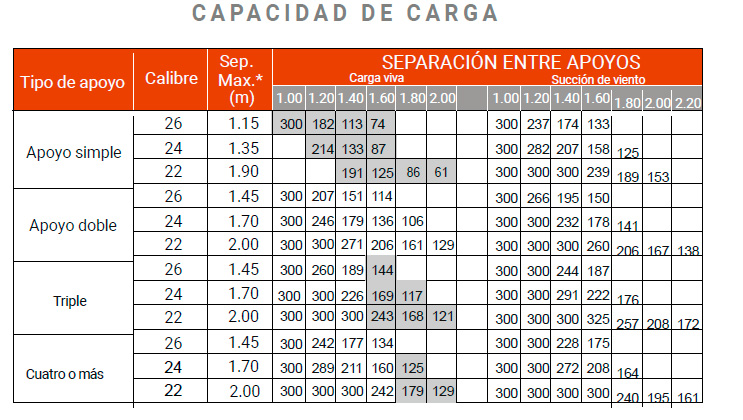 (*) • Separación entre apoyos máxima recomendada para una carga de 100 kg al centro del claro hasta un claro de 2., claros de 2 o más metros, se consideran dos cargas concentradas.