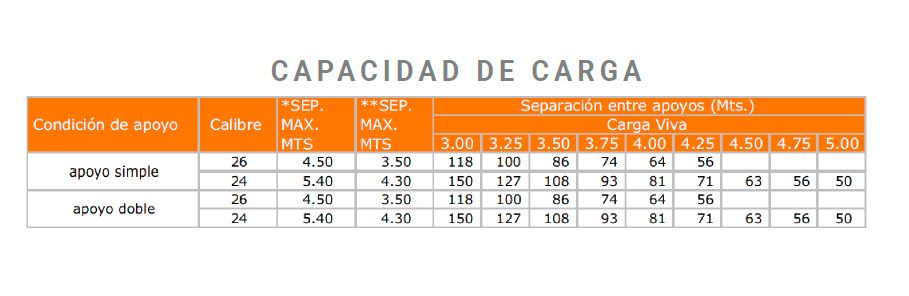 (*)Separación entre apoyos máxima recomendada para una carga de 100 kg al centro del claro hasta un claro de 2 m, claros de 2 o más metros se concideran dos cargas concentradas.