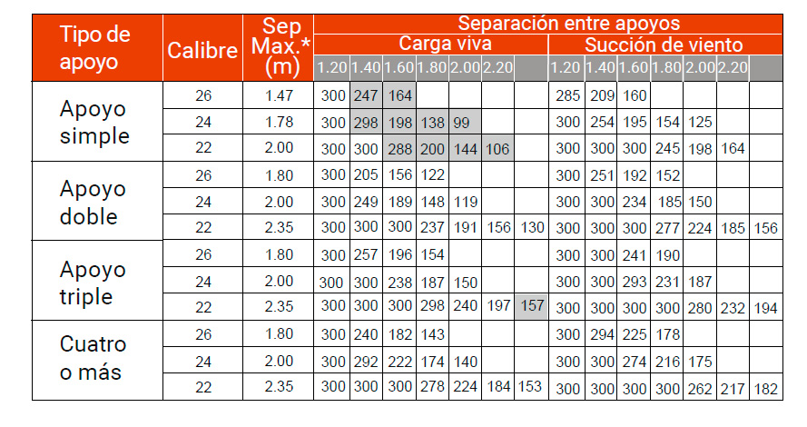 (*)Separación entre apoyos máxima recomendada para una carga de 100 kg a centro del claro hasta un claro de 2 m, claros de 2 o más metros, se consideran dos cargas concentradas.